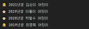 "%s %d년생 %s 어린이%n",