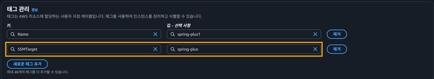 이후 CD 과정에서 ssm:resourceTag/SSMTarget = spring-plus 조건으로 인스턴스를 선택하게 됩니다.
