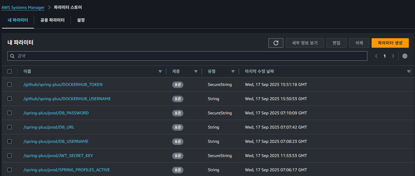 /github/spring-plus/*: GitHub Actions CI용 파라미터/spring-plus/prod/*: 운영서버 CD용 파라미터
