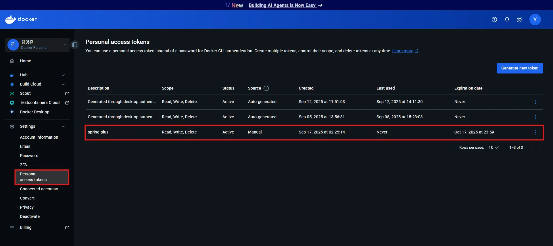 해당 토큰은 GitHub Actions에서 Docker Hub에 로그인할 때 사용됩니다.